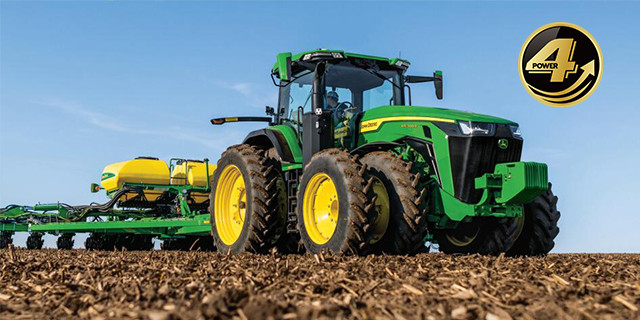 約翰迪爾 8R 系列拖拉機,通過一些列重大技術變革,滿足國四排放標準,可以支持長時間高效率的作業,為用戶帶來非同凡響的收益表現。配備約翰迪爾 6 缸9.0 升 24 氣門高壓共軌國四發動機,大儲備扭矩發動機能夠提高拖拉機在多變的地況下適應負荷變化的能力,在保證作業質量的前提下,有效降低因頻繁換擋造成的變速箱磨損和油耗增加,使用戶獲得更多收益。電控硅油風扇離合器,在提高散熱效率的同時有效降低油耗,能使拖拉機在重負荷作業時有更好的燃油經濟性,降低用戶使用成本。全車配置 10 多個電腦模塊、20 多套軟件,檢測和控制拖拉機運轉,高度智能的 8R拖拉機提供人性化輔助功能,例如燈光編程、雙轉速發動機巡航等,具備高度智能的自診斷功能,還可精確控制執行部件動作,例如懸掛架提升、下降、力反饋等。通過提供地頭一鍵化操作,簡化駕駛員操作,并能有效降低人為操作的誤差,即使是新手駕駛員也能輕松應對田間作業。約翰迪爾 16X4 全動力換擋變速箱,具有專為降低換擋沖擊的柔性換擋功能,使變速箱換擋更平穩;先進的控制程序能夠提供平穩的換擋操作,減少對驅動系統的沖擊,延長變速箱使用壽命,快速的擋位調節,在保持作業質量的同時提高作業效率。
